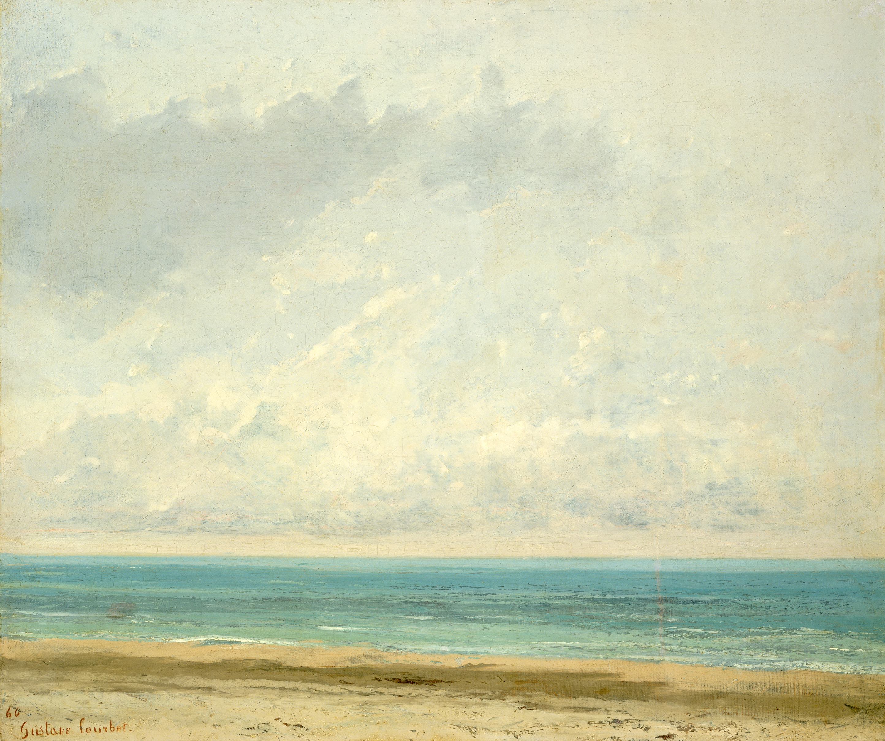 The painting depicts a calm sea on a sunny day. The water is a deep blue, and the sky is a clear blue. The painting is a simple and serene scene, but it is also a powerful reminder of the beauty of nature.