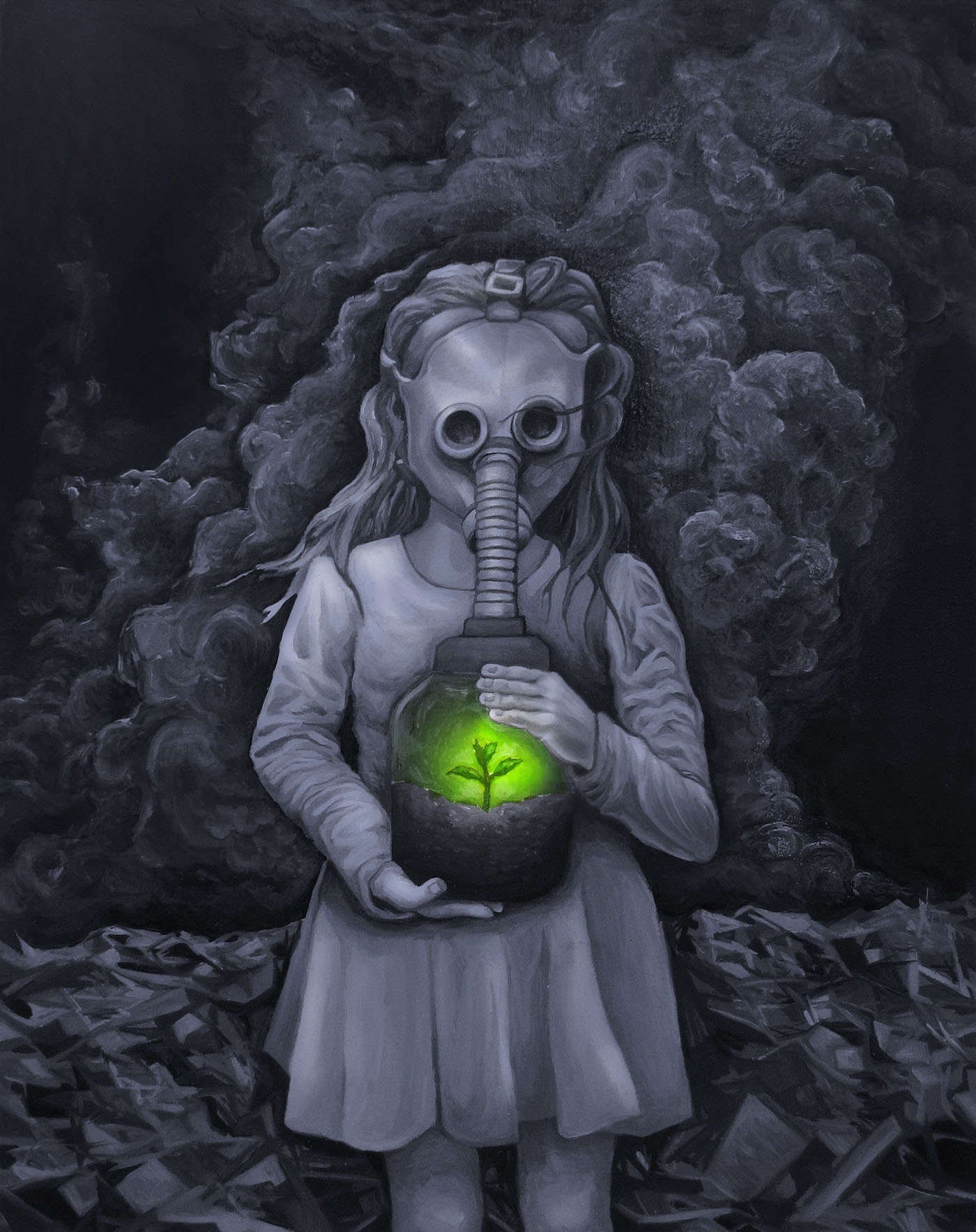 The girl can only breath from the tiny one sprout in her gas bottle throughout the gas mask because the air is too polluted with mountain of garbage on the earth. Smoke behind the girl also represents pollution which is destroying the Ozone layer right now.