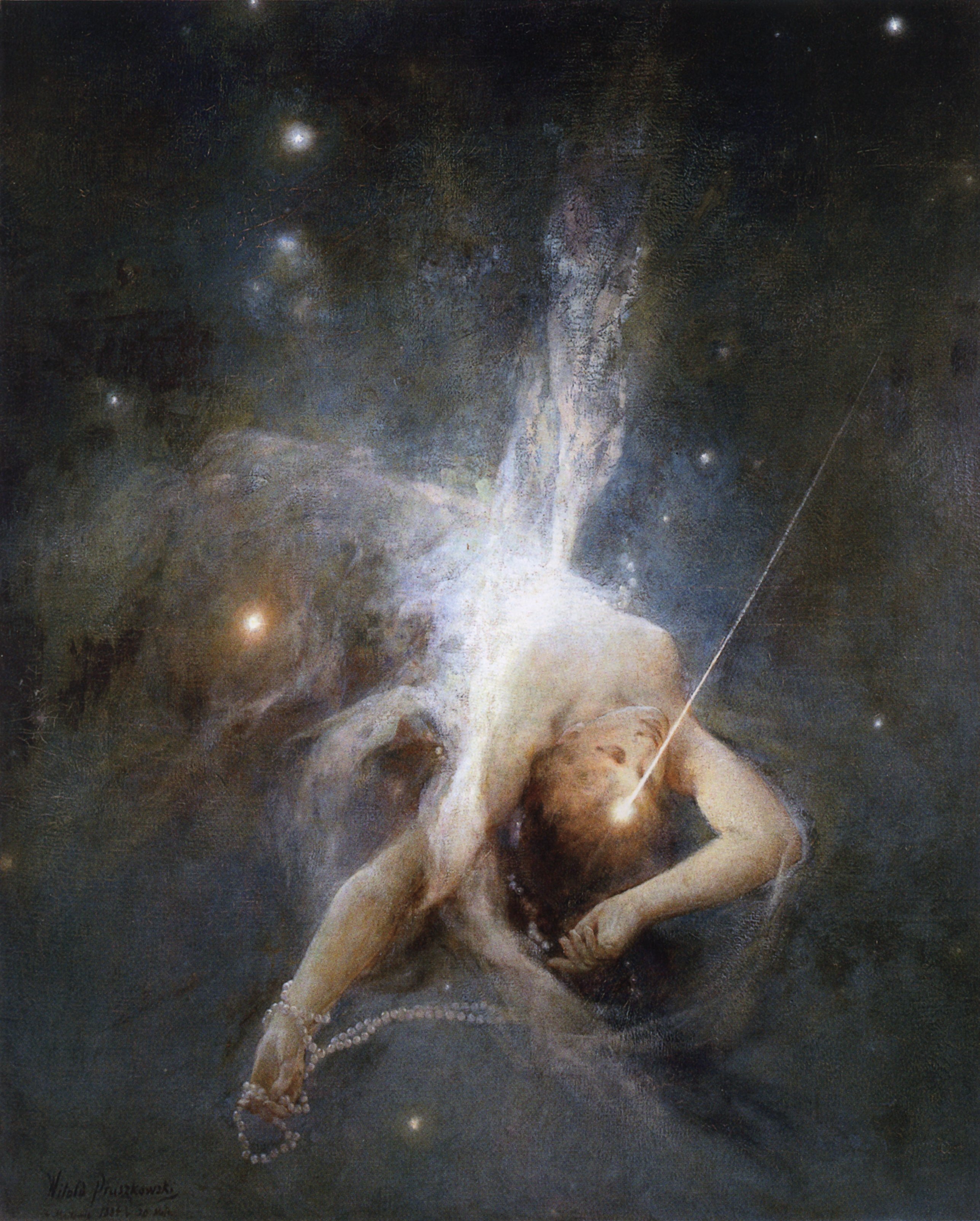 The painting is a beautiful and haunting image of a woman contemplating the beauty and mystery of the universe. The artist’s use of light and shadow creates a sense of atmosphere, and the woman’s pose is both sensual and vulnerable. The falling star is a symbol of hope and possibility, and it adds a touch of magic to the painting.
