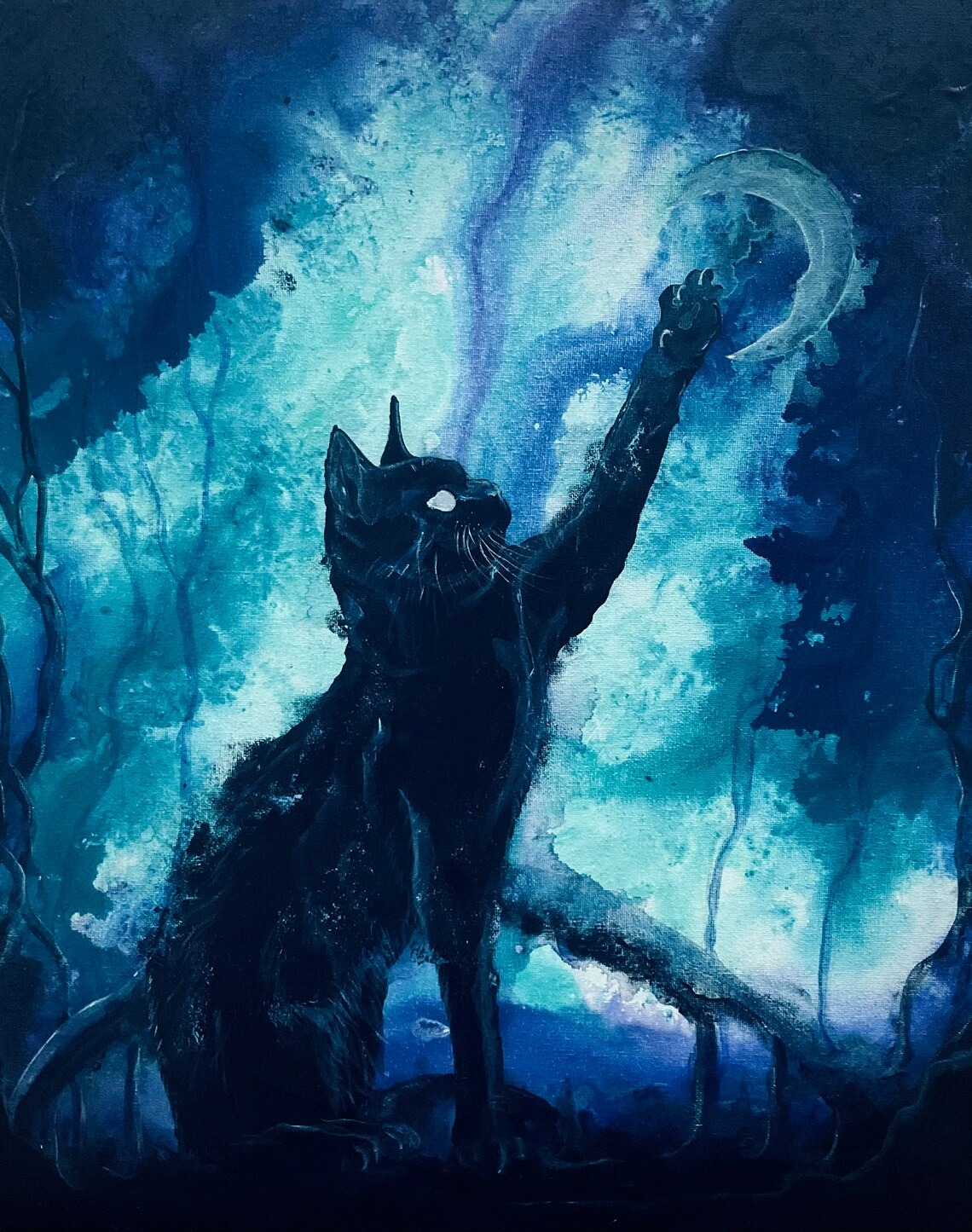 Shadowy Haunted Black Cat Reaching out Paw to Surreal Crescent Moon