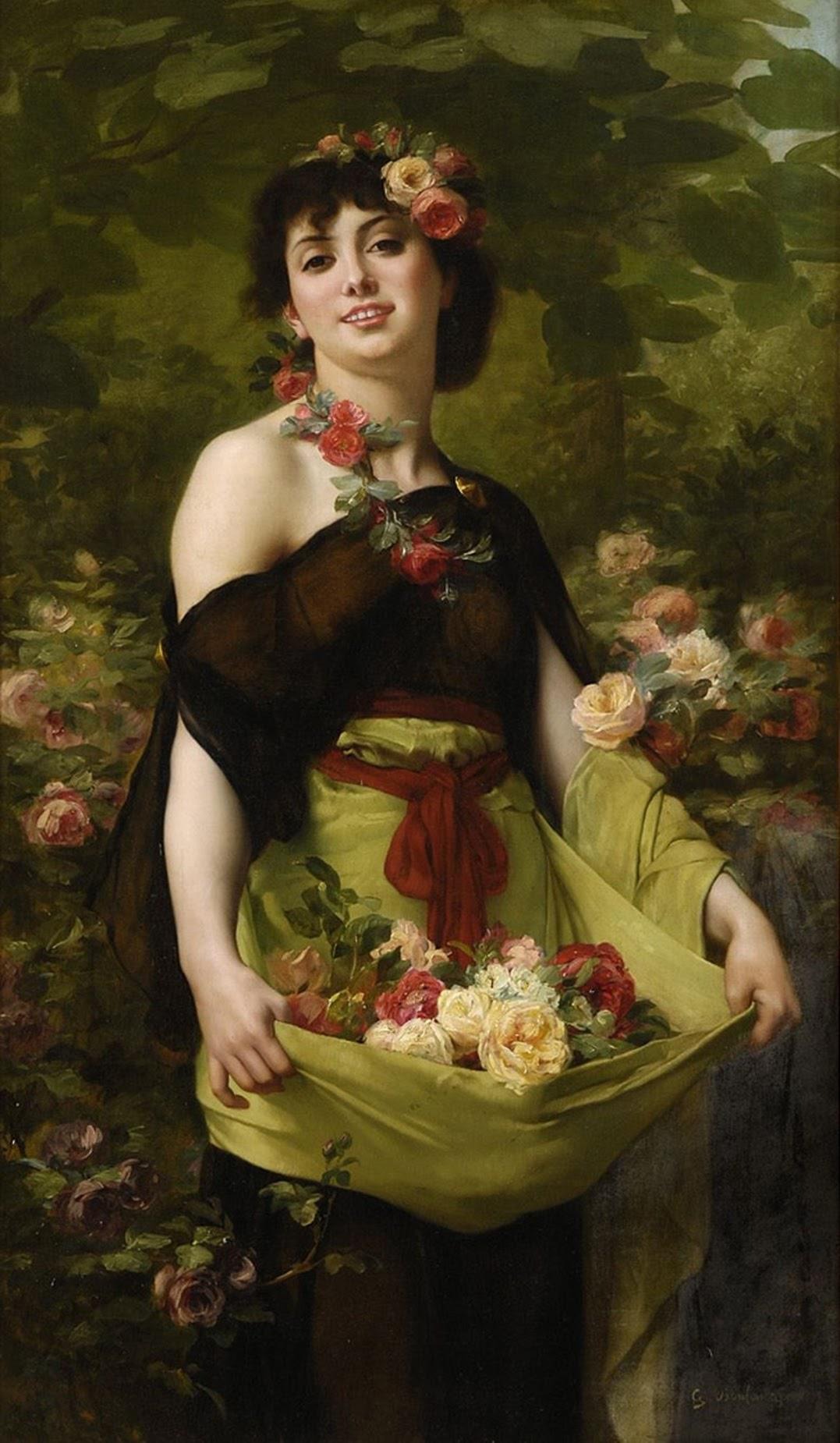 The painting depicts a young flower girl standing in the street. She is wearing a simple white dress and a red scarf, and she is holding a basket of flowers in her hands. The girl is looking directly at the viewer, and her expression is one of innocence and determination.