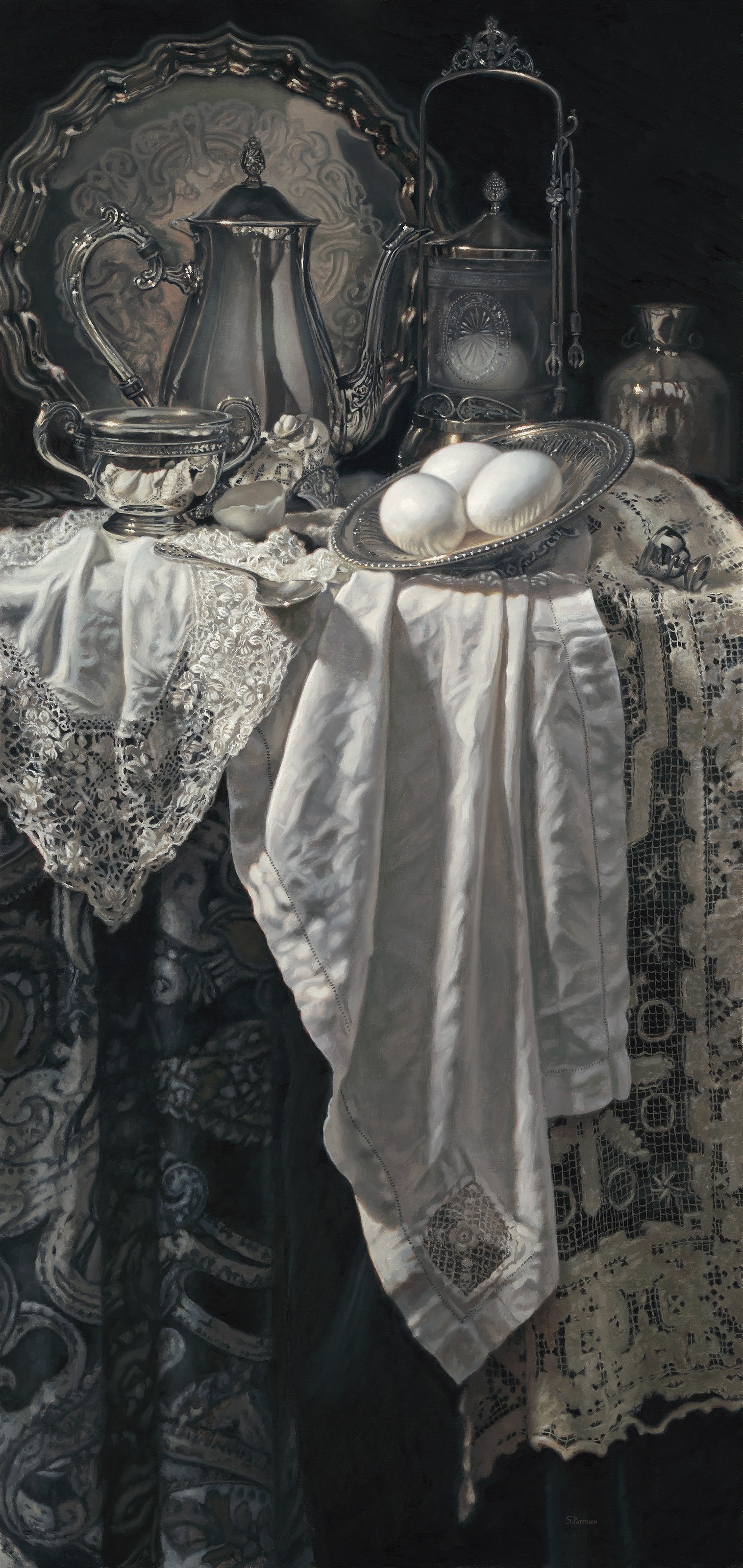 The painting depicts a still life arrangement of a silver teapot, lace doilies, and three eggs. The teapot is placed on a lace doily, and the eggs are arranged in a row next to the teapot. The background of the painting is a light blue, and the objects are rendered in a realistic style