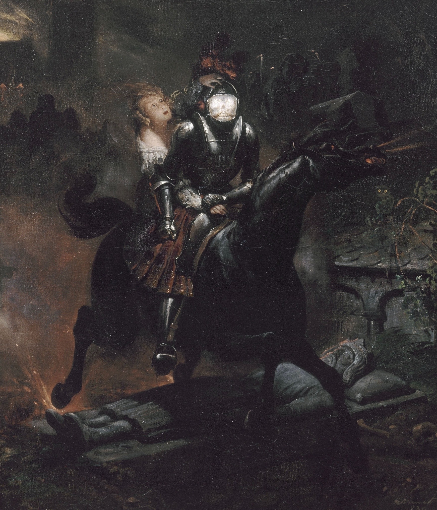 The painting depicts a scene from the German ballad Lenore by Gottfried August Bürger. The ballad tells the story of a young woman who is tricked by the devil into riding with him to her own funeral. In Vernet’s painting, Lenora is seen riding on a black horse, followed by a group of skeletons. The scene is set at night, and the sky is dark and stormy.