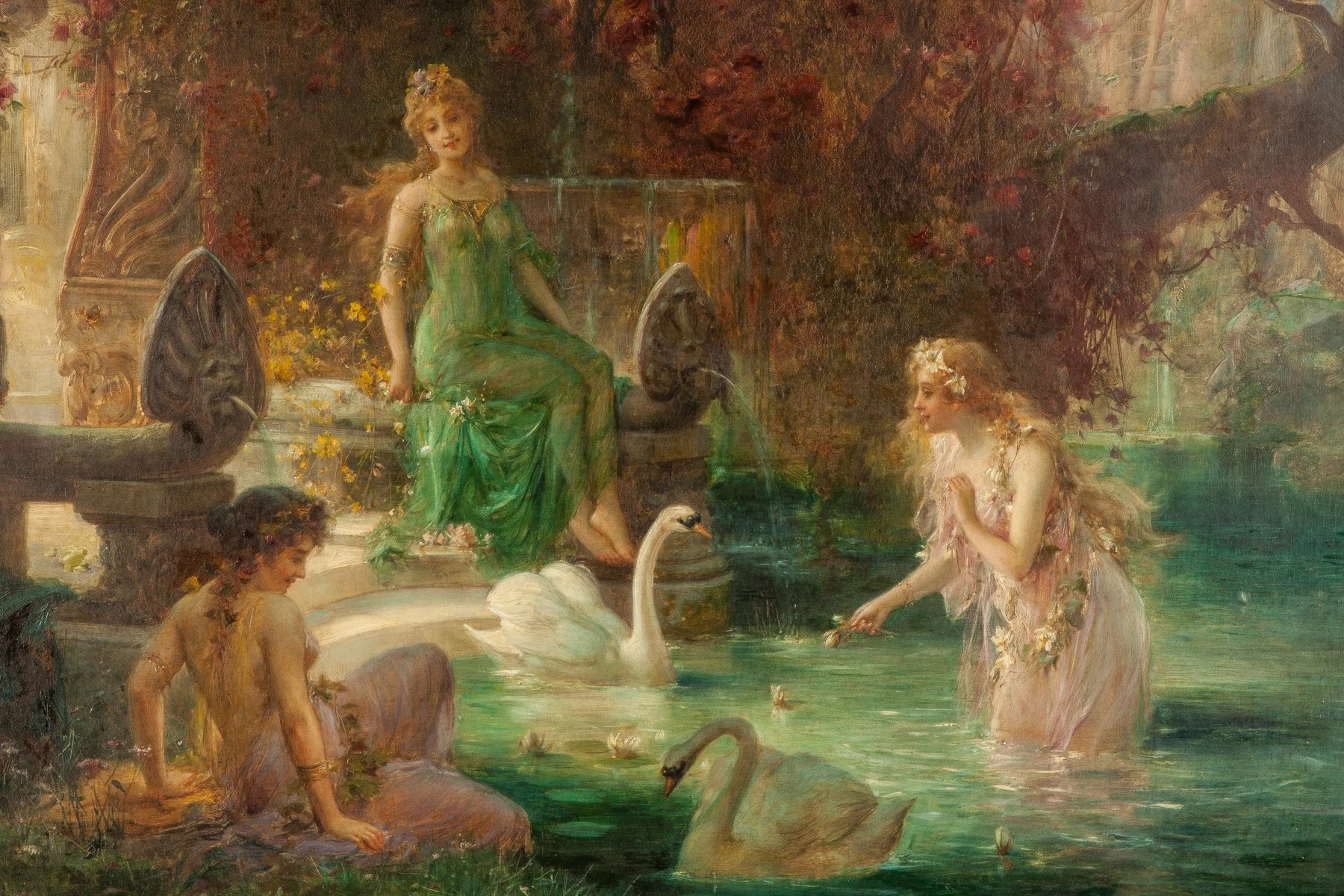 The painting depicts three women in classical Greek or Roman attire standing near a pool and feeding swans. The women are all beautiful and slender, with long flowing hair. They are dressed in light, flowing garments that reveal their figures. The swans are graceful and elegant, and they seem to be enjoying the food that the women are offering them. The scene is peaceful and serene, and it evokes a sense of beauty and tranquility.